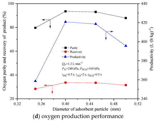 As the particle size decreases, the fronts of nitrogen-adsorbed concentration, gas phase oxygen mole fraction and gas temperature become sharp at end of PR and AD step, which effectively improves the performance. However, the adverse effects induced by particle size reduction on the mass transfer zone become significant at very small particles conditions. When the particle size reduces to 0.35 mm, the axial dispersion effect of nitrogen through the gas phase stretches the mass and heat transfer zone toward the product end during the PU, PR and AD steps, which facilitates earlier nitrogen breakthrough and lowers the oxygen production performance. It is obvious that the total mass transfer resistance cannot be indefinitely decreased though reducing the particle size of adsorbents, because of significant axial dispersion effect with very small particles.