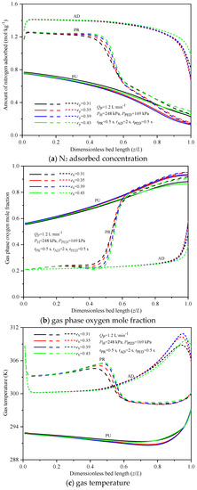 The diameter reduction of a zeolite particle is intended to decrease the resistance of macropore diffusion and improve the rate of mass transfer. However, the contributions of film resistance and axial dispersion effect become significant with a decrease in particle size. Figure 5a–d depict the influence of particle size on the profiles of nitrogen-adsorbed concentration, gas phase oxygen mole fraction, gas temperature and the oxygen production performance at the end of pressurization, adsorption and purge steps of the RCPSA process when the film resistance, macropore diffusion and axial dispersion effect are included in total mass transfer resistance.