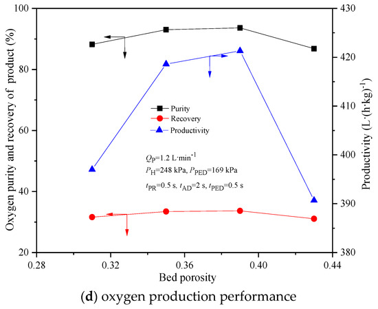 Figure 6d shows an optimal oxygen purity and recovery with high productivity is achieved around the bed porosity of 0.39. It is worth noting that there is a significant decline in the performance with large bed porosities. The primary potential contributor to the performance drops is the axial dispersion effect. This results also demonstrates the effects of axial dispersion when determining the overall resistance of mass transfer for small particles. It is therefore recommended that the porosity of bed should be decreased as much as possible to improve comprehensive process performance.
