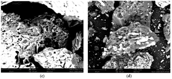 To verify the influence of the MCPA adsorption and regenerations treatments on the ACs’ surface, they were characterized by SEM-EDX and FTIR. Figure 1a,b illustrates the surface morphology of ACs before MCPA adsorption, Figure 1c illustrates the ACs’ surface covered by an MCPA white film, and Figure 1d shows the ACs’ surface after being saturated and regenerated by washing method followed by a thermal treatment.