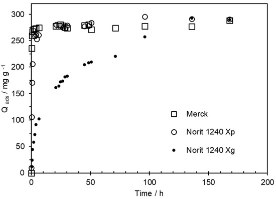 The adsorption capacity of ACs for different pollutants, in the aqueous phase, depends on numerous factors, and this complexity represents a challenge for researchers. Prior optimizations were made to some of the factors affecting the removal of MCPA by ACs from the aqueous phase [7]. Based on these conditions, the MCPA adsorption was carried out from a solution in which the pH was adjusted to 3. The time needed to establish the adsorption equilibrium was evaluated on Merck (powder form) and Norit 1240 in granular (Norit 1240 Xg) and powder form (Norit 1240 Xp) from a solution containing 150 mg L−1 of MCPA, and the results are shown in Figure 3.