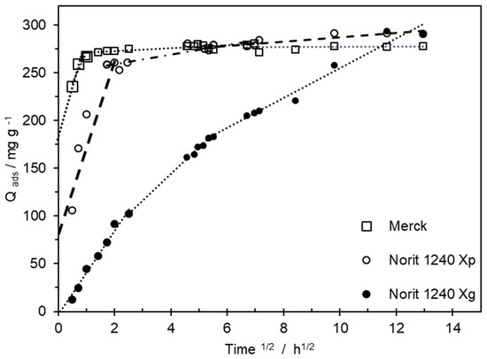 For the Merck and Norit 1240 Xp ACs, the representation of Qads versus t 1/2 presents three linear steps, but the second and third steps have a very similar slope. With both ACs, all linear regression intercepts the y-axis in a positive value. Based on the work by Liao et. al (2013), this allows stating that intraparticle diffusion is not the only rate-controlling step for MCPA adsorption [26]. The first step was attributed to the occupation of the available surface sites on the external surface area through electrostatic attraction. This adsorption step is responsible for the fast process of the pseudo-second-order model and for the high Kip1 values presented in Table 3. The Merck and Norit 1240 Xp ACs presented very high initial constant rates, which agrees with the kinetic profile presented in Figure 1.