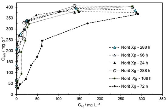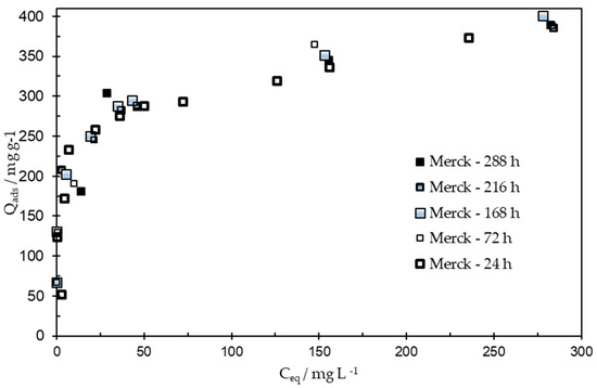 Adsorption isotherms were performed using MCPA solutions with concentrations varying from 5 to 500 mg L−1, at a pH = 3, after different contact times (from 24 to 288 h), as presented in Figure 5 and Figure 6. The maximum adsorption capacity attaints 401.3 mg g−1 on Norit 1240 Xp, 392.2 mg g−1 on Merck, and 403.7 mg g−1 on Norit 1240 Xg after a contact time of 288 h, as shown in Figure 5 and Figure 6. Some assays were conducted in triplicate (or even more) and were very reproducible, with a maximum standard deviation of 5 mg g−1.