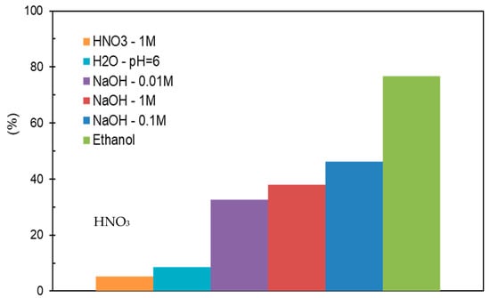 Because the adsorbent loses its efficiency after becoming saturated, the regeneration process, or desorption of pollutants from the adsorbent, is crucial. Recent publications have emphasized the value of recycling used adsorbents rather than disposing of them [26,31,33]. The goal of the regeneration steps is to eliminate contaminants from the pores and external surface area without reducing the adsorption capacity. In this work, after being saturated with MCPA, the ACs were regenerated with different washing solutions and through thermal treatment. First, the same volume of six different solvents or solutions (ethanol, distilled water, NaOH—1, 0.1, and 0.01 mol dm−3, and HNO3—0.1 mol dm−3) was added to a similar amount of saturated MCPA–ACs. These suspensions were kept in a thermostated bath under agitation at 298 K for 24 h.