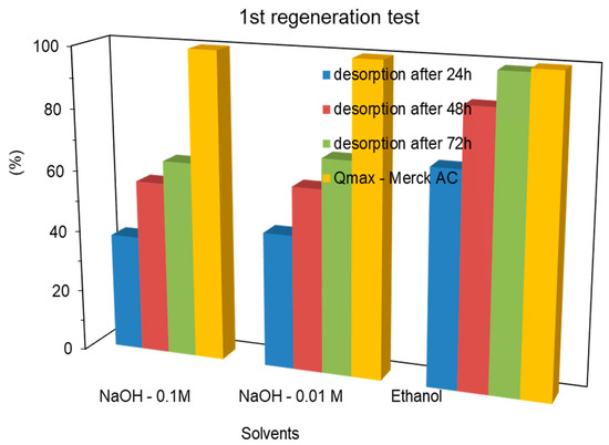 On the Merck AC, on the first regeneration cycle, after a contact time of 24 h and using 100 mL of washing solution, the desorption percentage of MCPA achieved 37.7 and 43.7%, with NaOH of0.1 and 0.01 mol dm−3, respectively. Ethanol washing allowed to reach a removal percentage of 69.2%, as shown in Figure 8. After 72 h, (3 × 100 mL washing steps), the desorption percentage of MCPA with the basic solutions reached 63.8 and 69.0%, with NaOH 0.1 and 0.01 mol dm−3, respectively. Yet, ethanol was allowed to reach a desorption percentage higher than 99%.
