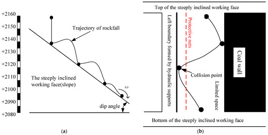 Rockfalls on the ground are a common disaster phenomenon that could very easily occur in the process of mining, which poses a great threat to human production and life [1,2,3,4]. In addition to rockfalls on the ground, many recent examples have shown that rockfalls can also occur in underground SDCSs. A SDCS refers to a coal seam with a buried dip angle of 35–55°, which is recognized as a difficult coal seam in the mining industry around the world. In recent years, great progress has been made in the theoretical research, technical applications, and equipment development for steeply dipping coal seam mining, and the basic safety problems of steeply dipping coal seam mining have been solved. However, during the mining process of longwall working faces in SDCSs, large gangue and large coal blocks are rolled and injured, and accidents destroying equipment occur frequently, which seriously restricts the safe and efficient production of the mine. Rockfalls have become a unique dynamic disaster and the main hidden danger in the mining of longwall working faces in SDCSs [5,6]. Rockfall hazards in the long walls of SDCSs also have a colloquial name: “flying gangue” hazards [7]. Accurate prediction of the migration process of a rockfall and its collision with equipment is an important basis for the protection against rockfalls in SDCS [8]. The schematic of the trajectory in SDCS is shown in Figure 1 [9].
