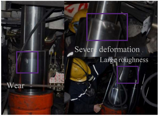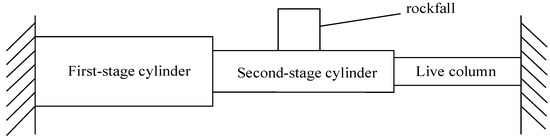 From the current published literature, the research on rockfall impact on equipment has only been carried out using laboratory simulations based on actual measurements of rockfall disasters in the working face. However, these simulations lacked theoretical research on the mechanism of rockfall impact on equipment. The field measurement statistics of rockfall disasters show that when rockfalls damage equipment, this phenomenon mostly occurs on the hydraulic support column, as shown in Figure 2 [7,11]. Therefore, this study took the impact process of polyhedron rockfalls on the hydraulic support column in a SDCS as the research object, introduced the Hertz contact theory model, deduced the formula of the maximum deformation and the maximum normal impact force of the column, and used the Hamilton principle and the Galerkin discrete method to construct a collision dynamics model to study the energy evolution law of the support column under rockfall impact load.