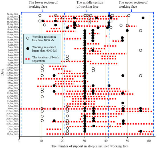 Coal wall spalling is an important source of random separation blocks, and its counts can reflect the number of random separation blocks [18,19]. In order to study the characteristics of block separation in the initial failure stage of coal wall, a nine-month information collection of coal wall spalling was carried out in a steeply inclined working face from October 2012 to July 2013, the statistical results are shown in Figure 3 and Table 1, the red mark in the diagram indicates that the coal wall spalling occurs at the corresponding numbered support at this time node.