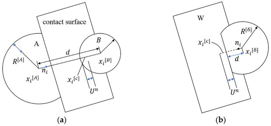 In Figure 4, and represent the location of the center of the adjacent particles A and B, respectively; is the distance between particle A and particle B; is the overlap between particles; and are the radius of particles A and B, respectively; is the unit normal vector of the contact plane between two contacting particles; is the radius of particle ; is the contact point position.