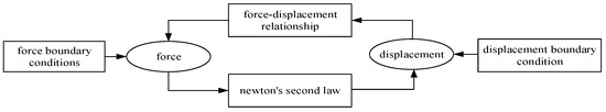 PFC, also known as particle flow theory, is a micro-computer program based on particle flow theory that was proposed by Professor Peter Cundall [20]. It can effectively solve complex micro-structure control problems, and it has good accuracy and stability. Therefore, this study used PFC3D software to simulate the migration process of a rockfall in the SDCS. In the whole analysis process, based on the force–displacement law and Newton’s second law, the contact force of the contacted part is updated through the force–displacement law. Through Newton’s second law, the position of the particles and the wall is updated, and the contact relationship between the particles is readjusted. The two alternates, iterate and traverse the entire particle set at a time step until the equilibrium state is destroyed and the stable state cannot be maintained. The mechanical model is shown in Figure 4, and the calculation process is shown in Figure 5.