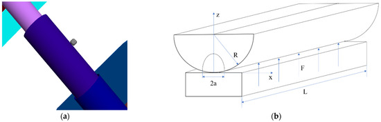 Hertz contact between cylinder and plane: (a) simulated diagram; (b) theoretical diagram.