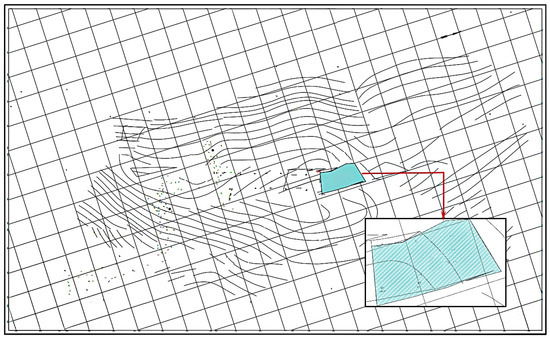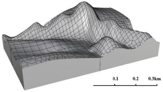 The parameters of this study were selected by referring to the geological conditions of the 25,221 working face of the Aiweiergou 2130 coal mine in Urumqi, Xinjiang, China. Figure 8 is the horizontal projection of the contour line of the coal seam floor. From the contour information in Figure 8, it was calculated that the color part is a SDCS. The region was captured to establish a 3D model of the working face floor, as shown in Figure 9.