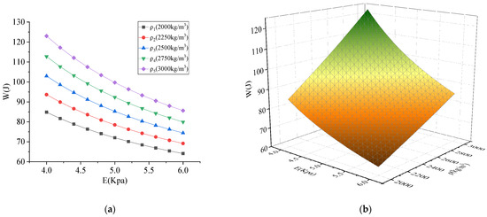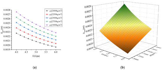 Influence of parameters on maximum deformation for elastic modulus vs. density: (a) two-dimensional graph; (b) three-dimensional graph.