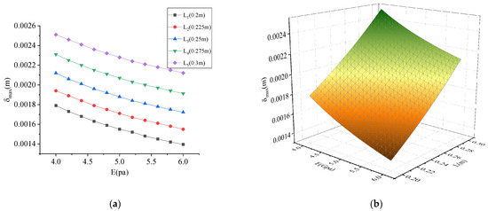 Influence of parameters on maximum deformation for elastic modulus vs. side length: (a) two-dimensional graph; (b) three-dimensional graph.