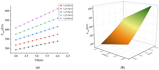 Influence of parameters on maximum impact force for elastic modulus vs. velocity: (a) two-dimensional graph; (b) three-dimensional graph.