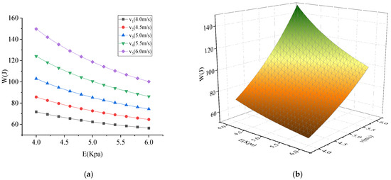 Influence of parameters on energy absorbed by column for elastic modulus vs. velocity: (a) two-dimensional graph; (b) three-dimensional graph.
