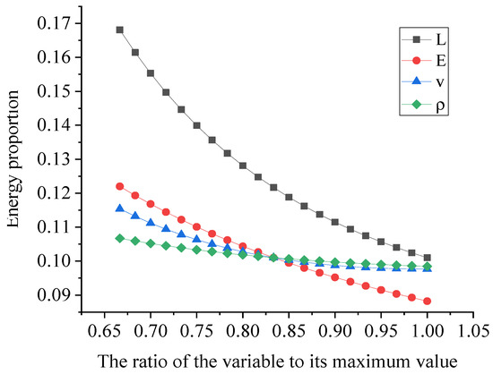 The four parameters used the ratio of their minimum value to their maximum value as the independent variable. The ratio of the energy absorbed by the column to the total energy was the dependent variable. It can be seen from Figure 21 that when the ratio between the parameter and its maximum value increased, the energy proportion decreased accordingly, and the slope of the curve became gentler and gentler. The energy proportion of the rockfall side length was higher than that of the other parameters throughout the whole range of values. The curves of density and velocity were very similar. When the curves reached the endpoint, there was little difference between the values of side length , density , and velocity , which were much higher than the value of elastic modulus . The three curves of elasticity modulus , velocity , and density intersected at the same point with coordinates of (0.833, 0.101). When the coordinate interval was (0.667, 0.833), the order of energy proportion was as follows: > > > . When the coordinate interval was (0.833, 1), the energy proportion was roughly sorted as follows: > > > . The energy proportion sorting table is shown in Table 5.