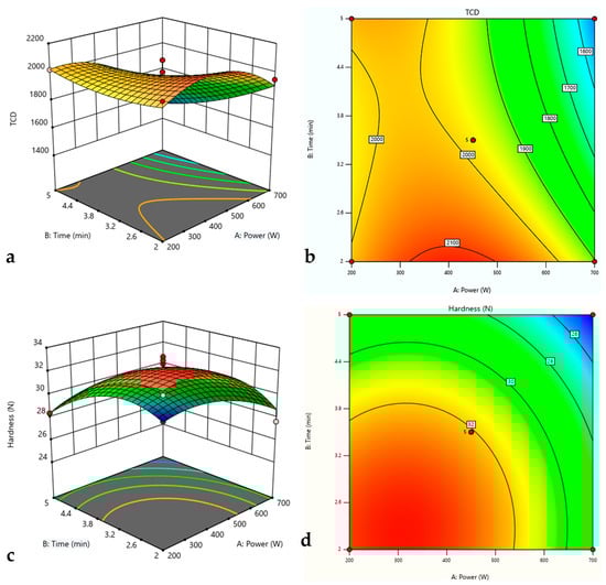 Interactive effect of microwave power (W) and time (min) on total colour differences (TCD) (a,b), hardness (c,d), and DPPH radical scavenging activity (e,f).