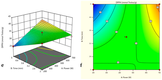 The calculated “Lack of Fit” p-value of 0.43 indicated that the “Lack of Fit” was insignificant compared to the pure error. In addition, the predicted and adjusted R2 values were 0.6853 and 0.8075, respectively (difference < 0.2). The “Adeq Precision’’ ratio was 16.065, showing an adequate signal for the model to navigate the design space. A CV of 4.44 indicated that the model has good reproducibility (Table 3). As illustrated in Figure 1e,f, the interactive effect of power, time, and DPPH radical scavenging activity microwave showed that power had a more positive impact on DPPH radical scavenging activity than time. Enhanced DPPH radical scavenging activity could be attributed to the increased extraction of antioxidant compounds such as polyphenols and tocopherols due to the increased disintegration of the pecan cell walls and loosening of the cellulose and pectin networks []. On the other hand, increased microwave power could have increased the development of Maillard reaction products with antioxidant properties []. Enhanced antioxidant activity with increased roasting power was also reported on cashews, fox nuts, and almonds [,,].