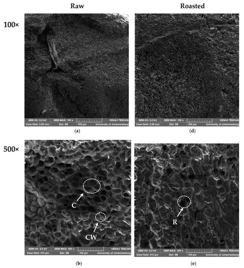 Scanning electron microscopy (SEM) was applied to compare the microstructures of raw pecan nuts and pecan nuts microwave-roasted under optimised conditions (700 W for 2.24 min). As shown in Figure 2d, microwave-heated pecan samples were characterised by conspicuous perforations on the cell walls. According to Tu et al. [] the observed perforations could be due to electromagnetic waves that were converted into heat energy and caused a rapid increase in the nuts’ temperature and created intracellular pressure that ruptured the pecan nuts’ cell walls. Meanwhile, the parenchymal cells from raw pecan nuts had intact cell walls and a smaller number of pores or void spaces (Figure 2b,c). This could be attributed to the moisture content in raw nuts, which maintained and supported their structural integrity [,]. Figure 2e,f show disintegrated and damaged parenchymal cells due to microwave treatment. Greater porosity and void spaces were also observed in the cells of microwave-roasted pecan nuts compared to raw pecan nuts []. Similar results were reported from microwave-roasted almonds [] and microwave-treated hazelnuts []. These microstructural changes could be responsible for the enhanced DPPH radical activity in the current study (Figure 1e,f) due to increased porosity and dissociation of antioxidant compounds bound in the seed matrices that led to their improved extraction with methanol (Figure 1e,f; []).
