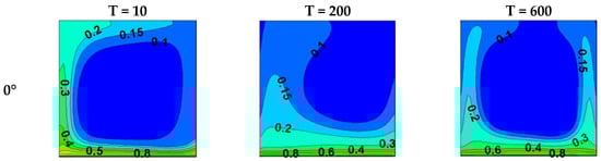 Charge density distributions for various tilt angles and electrical Rayleigh numbers are illustrated in Figure 4. At an extremely low electrical Rayleigh number (T = 10), thermal forces dominate, and buoyancy forces entirely dictate the movement of electric charges. Indeed, electric charges exhibit an upward orientation in the vicinity of the hot wall, while they manifest a downward direction close to the cold wall. This creates a kind of ring inside the cavity. The inclination of the cavity seems to have no impact on the charge density distribution. Conversely, for a large electric Rayleigh number (T = 600), electrical forces take control. Both electric plumes along the vertical walls take place regardless of the cavity’s tilt. Finally, for a moderate electrical Rayleigh number. A single plume originates along the hot wall, where the thermal and electrical forces cooperate. However, on the cold wall side, the downward thermal forces seem to be more dominant for α = 0 and 45°, preventing the development of a second plume. In this case (moderate T value), the cavity inclination affects the charge density distribution topography. As the angle α reaches 90° a shift occurs from a single-plume pattern to a bifurcated-plume arrangement situated at both the upper and lower regions of the cavity. For α = 0°, the charge distribution aligns closely with the findings reported by Hassen et al. [36] and Traore et al. [37].