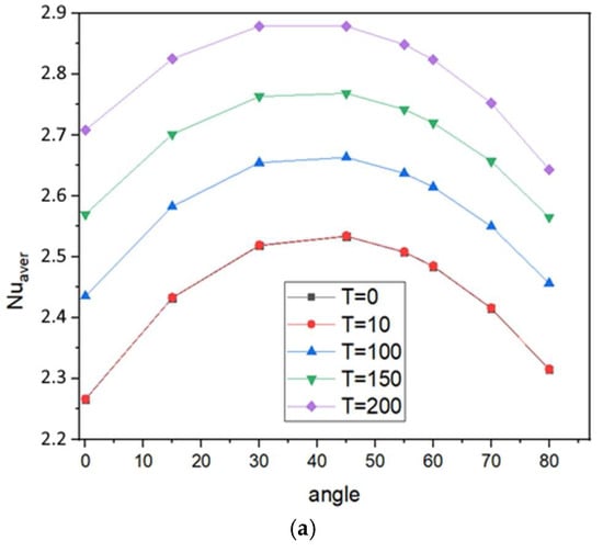 The mean Nusselt number according to the tilt cavity for various T values is shown in Figure 6. Two distinct behaviors can be recorded for T ≤ 200, as depicted in Figure 6a. The profile of the mean Nusselt number follows a parabolic shape with a maximum around an angle of 45°. It is interesting to report that the outcomes for T = 10 and T = 0 are identical. This similarity arises because, for a low Rayleigh number, T < Tc below the critical Rayleigh number (commonly referred to as the linear stability criterion [37]) the electric field has an insignificant impact on natural convection. Increasing T leads to a thermal transfer enhancement of approximately 13% between T = 0 and 200. For high values of T (greater than 400), a reduction in Nu can be observed between 200 and 400 due to bifurcations from a single-cell flow to a two-cell flow. Further, increasing T results in the intensification of the average Nusselt number, reaching an improvement of 61% between T = 0 and T = 800. It should also be noted that for high electrical Rayleigh values, the profile of the average Nusselt number exhibits horizontal lines, indicating that the electrical forces are so dominant that the cavity tilt has no influence on the heat exchange process, and the only controlling parameter is the electrical force.