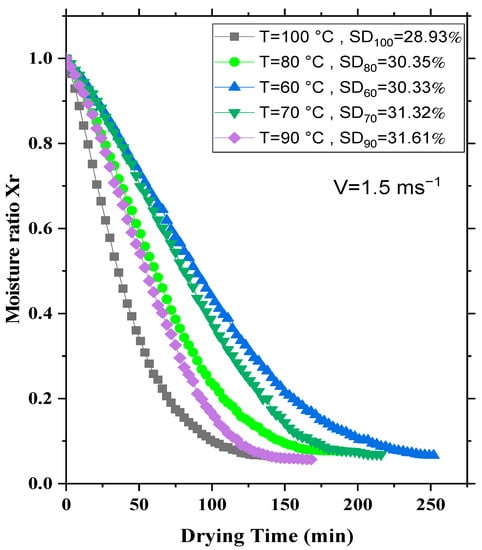 Figure 2 illustrates the variation of the dimensionless moisture content (Xr) as a function of the drying time (t) for a speed of the drying air equal to 1.5 ms−1. As expected, drying kinetics are significantly affected by the temperature of the drying air.