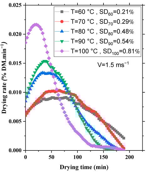 Indeed, an increase in T for a limited time causes a drastic decrease in X. This is explained by the evaporation phase, which accelerates with an increase in temperature. In fact, the times necessary to reduce the humidity of the product to about 8% are, respectively, 219 min at T = 60 °C, 178 min at T = 70 °C, 155 min at T = 80 °C, 121 min at T = 90 °C and 108 min at T = 100 °C. Hence, this increase in the temperature of the drying air leads to a rise in the heat flow brought by the air to the sample and thus an acceleration in the evacuation of the water molecules from the inside to the outside of the sample. These findings are in good agreement with previous work on the drying of olive pomace [26,27,28]. Due to the presence of different types of moisture in the olive pomace sample, its migration and release into the evaporative process occurs in different stages. This trend appears in all curves in Figure 3. Hence, each curve corresponding to an isothermal temperature could be divided into three stages as discussed by Zhao et al. [29] and Li et al. [30], even though both research teams worked on a different substance (lignite). According to Li et al. [30] and as we can see in Figure 3, these stages of drying are as follows: The first phase, which is a very short warm-up period during which the drying rate increases and the temperature of the sample reaches the temperature of the drying air. Afterwards, comes a period at constant speed (near the peak) during which the heat supplied by the drying air is entirely consumed to vaporize the liquid water and the temperature of the sample remains equal to the temperature of the drying air. In this phase, the surface of the product is saturated with water so that a thin film of liquid is kept on the surface, due to the migration of water from the core of the product to its outer surface caused by capillary pressure. It is a phase that is not easily identifiable because the cell walls disrupt the rapid migration of moisture to the outer surface. The third phase corresponds to the phase in which the speed of drying is decreasing. In this phase, the water transfer within the sample to the surface decreases and is no longer sufficient to maintain a constant drying rate. In this phase, the movement of water towards the surface of the sample is explained by Fick’s second law. In the same context, Zhao et al. [29] called them initial drying at constant speed, then drying at descending speed and finally, drying in depth.
