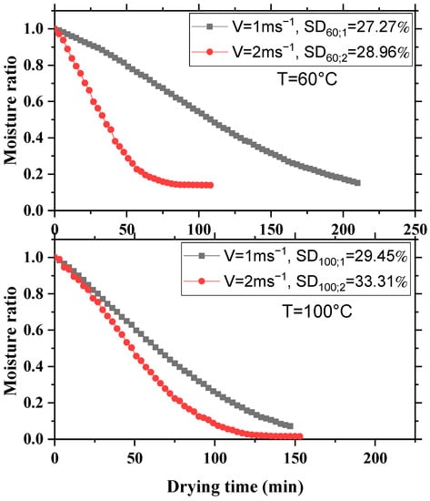 Figure 4 shows the effect of two velocities of the drying air while keeping the same temperature. To accomplish a moisture content of 10 to 15% at T = 60 °C, the drying time is 76 min for V = 2 ms−1 and 204 min for V = 1 ms−1. Thus, by doubling the speed of the drying air, we observe that the time required for drying is reduced by three times. This could be explained by the effect of turbulence when increasing the air velocity and the enhanced heat transfer to the sample. Thereby, the heat flux exchange and the moisture dehydration become more efficient with turbulence, as was reported in the literature [31,32]. However, it can be concluded that for high temperatures and especially for water’s boiling temperature (T = 100 °C), the drying air velocity factor becomes less effective (the drying time was 118 min for V = 1 ms−1 and is reduced to 83 min for V = 2 ms−1). Hence, temperature plays a more important role and the drying air velocity in this particular case.