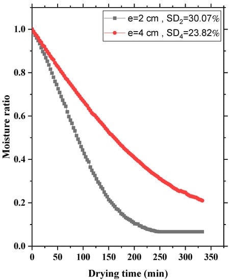 Figure 5 reports the change in humidity versus the time factor at T = 60 °C and V = 1.5 ms−1 for different layer thicknesses. It can be seen that the drying time increases when the sample thickness is higher. In a physical meaning, this could be due to the large distance that the moisture migrated to the surface. Indeed, to reach a humidity of 20%, the drying process took 333 min for a thickness equal to 4 cm, while it took only 156 min for the thickness of 2 cm. This result is in agreement with previous studies [33].