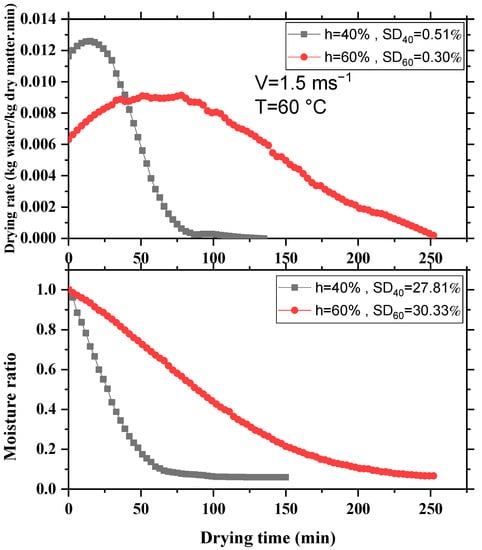 In this section, we investigate the impact of the initial humidity of the sample on the drying procedure. Figure 6 shows how the moisture content and the drying rate vary as a function of time, from two initial humidities of the biomass (40% and 60%). The curves indicate that the drying mechanism depends on the initial humidity content of the by-product. In fact, the figure shows that when the moisture content decreases, the drying time also decreases. More precisely, the time required for the drying of the sample containing 60% humidity is 183 min while it is 62 min for the sample containing 40% humidity under similar conditions (T = 60 °C, V = 1.5 ms−1 and e = 2 cm).