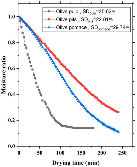 The weight of olive pomace represents about a third of the weight of crushed fresh olives. The main composition of whole olives is 39.54% dry matter and 60.46% water content, whereas, it has 85.17% pulp, 14.83% pits. The oil content is 14.36% in fresh matter [34]. In modern mills, a special machine is used to de-stone a given percentage of olives before they pass through the crusher. The recovered cores are then dried and used for several purposes, hence the interest in drying. The size “d” of the particles of pulps and cores used is between 0.1 mm and 2.0 mm. Figure 7 illustrates the moisture content versus drying time for the three sample types (pulp, pits and the olive pomace) with an initial humidity close to 60%, an air speed value equal to 1 ms−1 and a drying air temperature equal to 60 °C.