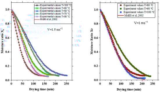 Experimental drying data compared to the mathematical model of Midilli et al. [18] (V = 1.5 ms−1 and V = 1 ms−1 and e = 2 cm).