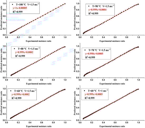 The validity of the model in our case is demonstrated by the fact that the experimental values of the moisture ratio are in excellent agreement with the predicted ones in the model under certain conditions as shown in Figure 8. Also, Figure 9 shows that the experimental findings are well fitted to the predicted ones for all experimental conditions.