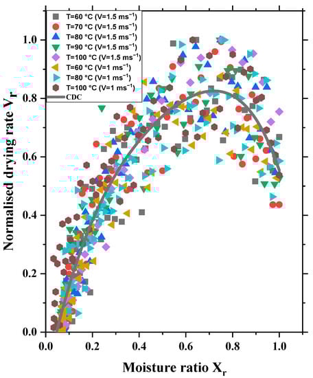 Then, a characteristic curve of the olive pomace can be found, despite the complexity of the microscopic phenomena. Equation (13) is available in the range of following experimental conditions: 60 °C ≤ T ≤ 100 °C; 1 ms−1 ≤ V ≤ 1.5 ms−1; and initial moisture h ≈ 60%.