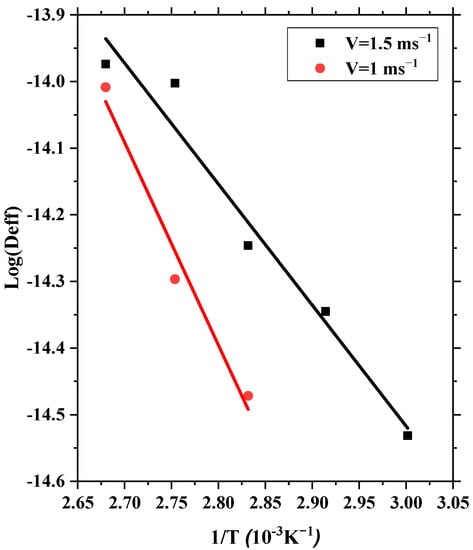Finally, we estimated the activation energy, which decreases from 25.309 kJmol−1 to 15.101 kJmol−1 when the speed increases from 1 ms−1 to 1.5 ms−1. We also calculated the effective diffusivity via the Arrhenius correlation.