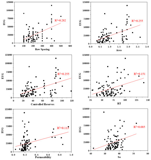 (2) According to Pearson correlation analysis, the initial production is moderately correlated with the number of fracturing stages and fracturing injection fluid volume. It is weakly correlated with the amount of sand volume, the length of the horizontal section, the resistivity, and the controlled reserves. The estimated ultimate recovery is moderately correlated with the spacing, area, and controlled reserves, and weakly correlated with the resistivity, permeability, oil saturation, reservoir, and sonic transit time.