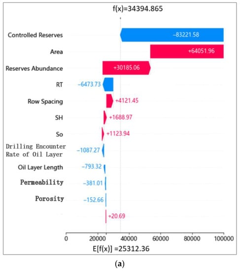 Figure 18 shows the explanation of a specific prediction, where Figure 18a displays the explanation results for Horizontal Well 1. The top five parameters that have the highest impact on the prediction value are controlled reserves, area, reserve abundance, So, and RT. The red bars show to what extent an input feature increases the prediction value. Controlled reserves, oil layer length, and drilling encounter rate of the oil layer have a positive impact and increase the prediction value. For example, oil layer length has a positive impact of 2217.42 m3 on the prediction value. The blue bars show to what extent an input feature decreases the prediction value. Area, reserve abundance, So, RT, SH, permeability, row spacing, and AC have a negative impact and decrease the prediction value to some extent. For instance, So has a negative impact of 4655.5 m3 on the prediction value. After being influenced by multiple input features, the SHAP baseline value produces an output value, which is the mean prediction value by the model is 25,312.36 m3.