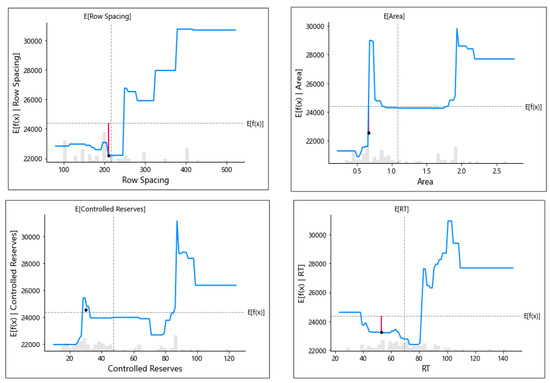 Figure 21 shows the distribution of SHAP values for the input parameters. Each row represents a feature, and each point represents sample data, with the horizontal scale representing the SHAP value, and the features sorted according to the average absolute value of the SHAP value. Areas with more points indicate that there are a large number of samples gathered there. Each data point in the figure represents a fractured horizontal well, and the color represents the value of the variable, with blue to red indicating a low to high variable value. Red features make the prediction value larger (positive correlation), blue features make the prediction value smaller, and purple is close to the mean. Positive (negative) SHAP values indicate that the parameter has a positive (negative) correlation with estimated ultimate recovery, and the SHAP value characterizes the range of change in the influence of each parameter on estimated ultimate recovery. For example, as the controlled reserves of the reservoir increase, the SHAP value increases; as the area of the reservoir increases, the SHAP value decreases, and different permeability values result in a small range of variation in estimated ultimate recovery.