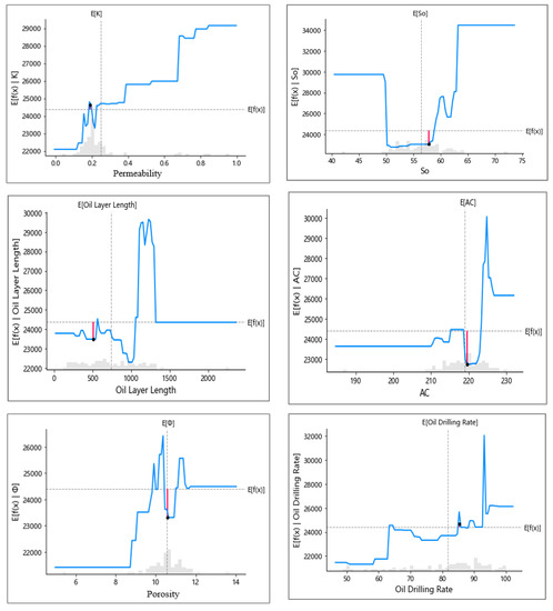When porosity is less than 9%, the expected model value is very low. With the increase of porosity, the predicted value rises rapidly until porosity reaches 12%, when the expected model value reaches its highest level and remains constant. When the porosity value is between 9% and 12%, the expected value fluctuates greatly, indicating that there are more data in this stage, and it has a greater impact on the expected value prediction. When permeability is less than 0.25, the predicted value is lower than the expected value. With the increase of permeability, the expected value increases in a stepwise manner. The first step is between 0.4 and 0.6, the second step is between 0.6 and 0.8, and the growth gradually slows down when permeability is greater than 0.8. When So is between 40% and 50% and greater than 65%, the expected predicted value is relatively high. This is a special case caused by the small number of horizontal wells in this range. When So is between 50% and 60%, the expected predicted value increases slowly. There is a fluctuation between 60% and 65%, indicating that the predicted value increases with the increase of oil saturation. However, due to the problem of the number of horizontal wells, there is a small-scale fluctuation.