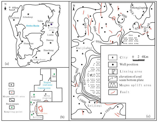 Geographical location of coal samples and structural outline of Linxing area. (a) Study area location in the Ordos Basin; (b) sample location; (c) structural outline map of the study area.