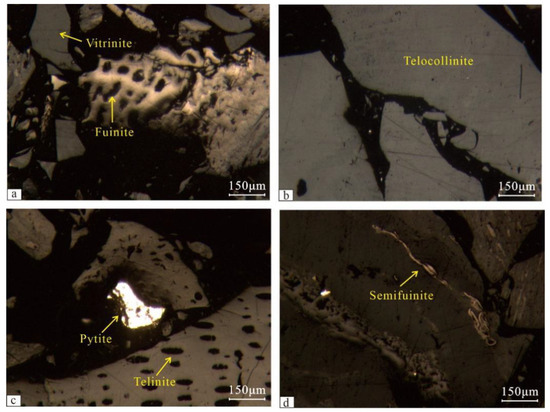 Photos of maceral constitution of coal specimens. (a) The vitrinite and fuinite of sample XG (burial depth of 450.0 m). (b) The telocollinite of sample L10 (burial depth of 1636.6 m). (c) The telinite and pytite of sample L41 (burial depth of 2458.0 m). (d) The semifuinite of sample L8 (burial depth of 1888.0 m).
