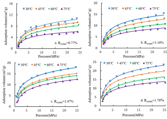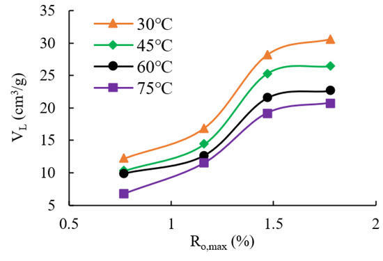 The maximal adsorption capacity of coal is characterized by the Langmuir volume, as shown in Figure 4, and the effect of coal metamorphism on adsorption was analyzed on the part of the temperature as a quantitative measure, and the temperature of 30 °C was used as an example. As the vitrinite reflectance of coal RO,max for 0.77% increases to 1.78%, the Langmuir volume increases from 12.23 cm3/g to 30.64 cm3/g. By quantifying the degree of deterioration of coal, we can analyze its adsorption characteristics. Taking coal with a maximum reflectance of vitrinite (RO,max) of 1.78% as an example, as the temperature increases from 30 °C to 75 °C, the Langmuir volume of coal decreases from 30.64 cm3/g to 20.78 cm3/g. This suggests that temperature has a passive influence on adsorption. Additionally, as the degree of coal deterioration increases, the coal adsorption capacity becomes stronger. This indicates that deteriorated coal has a higher capacity for adsorption compared to less deteriorated coal.