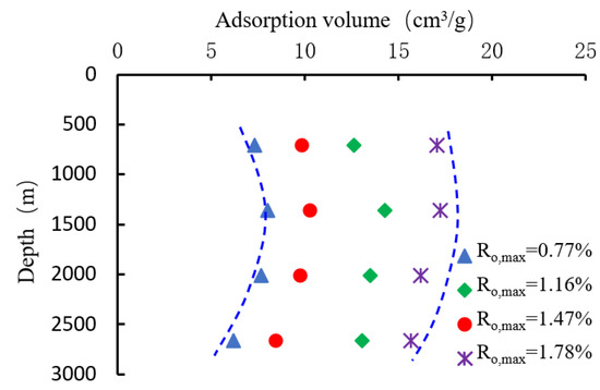In fact, the temperature, adsorption equilibrium pressure and coal maturity in the experimental tests all contribute to controlling the adsorption amount of gases in coal reservoirs. This understanding can be employed to predict or assess the gas component in coal reservoirs. The study shows that the variation of gas component with the increase in coal buried depth does not become a single positive or negative correlation, but a tendency of initial ascending and subsequent descending [21]. Based on the statistical dissection of suitable temperature logging and great experiment figures, the ground temperature gradient becomes 2.3 °C/100 m, and the formation pressure gradient is determined to be 0.98 MPa/100 m. By converting the temperature and adsorption equilibrium pressure conditions from the previous isothermal adsorption experiments to depth, we can establish characteristic curves that depict the correlation relationship between the theoretical adsorption gas quantity (Figure 5) and the depth at which the coal seam is buried. These curves provide valuable information on the potential gas content and distribution within the coal seam as a function of depth. Upon analysis, it is observed that the adsorption gas quantity displays an “inflection point” around 1200~1500 m. In a shallow depth, the adsorption gas quantity increases as the above-described depth escalates. The adsorption gas quantity decreases as the burial depth beyond this depth escalates. According to the Langmuir equation, shallow coal reservoirs are strongly influenced by reservoir pressure; as depth (i.e., hydrostatic pressure) increases, the ability to absorb methane increases significantly. However, with the increase in depth, the temperature also increases, which is unfavorable to the adsorption, and the negative effect of temperature becomes the main factor controlling the adsorption amount, which leads to the decrease in the gas content [22].