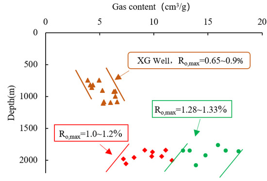 Consequences of desorption tests illuminate that the measured gas content of deep coal reservoirs in the Linxing area is 7.18~21.64 cm3/g, and the gas component of coal reservoirs within the Xiegou coal mine field is 3~8 cm3/g. As depicted in Figure 6, When the depth of the coal seam is less than 1200 m, the gas content tends to increase with the depth of the coal seam.. When the above-described depth is 1700~2100 m, the gas component of the coal reservoir does not have any obvious change rule with that depth as the variable. The gas component has a close correlation with the level of coal metamorphism, which shows that with the escalating coal metamorphism, the gas content of coal reservoirs becomes higher. The gas component of coal beds is influenced by various factors, including geological and tectonic conditions, coal bed methane preservation cover conditions and coal material composition. Therefore, the critical conversion depth of coal reservoir gas content is controlled not only by pressure and temperature. When predicting deep coalbed methane resources, it is essential to identify the dominant elements that control the gas.