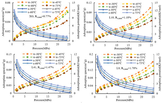 Based on Equations (1)–(5), these theoretical characteristic parameters of adsorption potential at four temperatures are calculated for four categories of coals with four levels of metamorphism. In the calculation process, pi in Equation (1) corresponds to the adsorption equilibrium pressure in isothermal adsorption experiments. T in Equation (2) is the adsorption experimental temperature, which needs to be converted from °C to k. As shown in Figure 7, the control of temperature on the adsorption potential was analyzed using coal specular plasma reflectivity and pressure as quantitative measures, and it can be concluded that the adsorption potential increases with the increase of temperature.. It is determined through analysis that with the escalating temperature, methane molecule movements intensify, resulting in a growing difficulty of adsorption. The effect of pressure on the adsorption potential is analyzed using the reflectance of coal mirror plasmas and temperature as quantitative measures. It can be concluded that adsorption potential and adsorption balance pressure are negatively correlated; in addition, the adsorption potential descends rapidly as pressure increases when the pressure is in a range from 0 to 5 MPa. While the pressure ascends, the adsorption potential decreases slowly. The analysis shows that the methane molecules prefer to choose the position exhibiting a higher adsorption energy potential for adsorption. First, the adsorption is carried out on the inner wall of the pore, and gradually, from monolayer to multilayer, the adsorption potential generated by the first adsorption is larger [29].