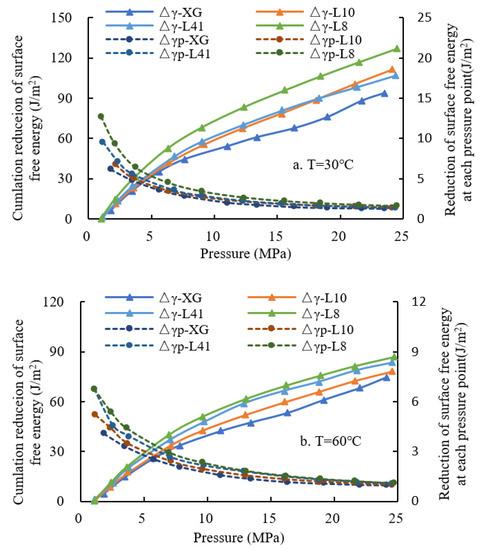 In association with Equations (6) and (7), the overall reduction within surface free energy of coal during adsorption under supercritical conditions could be calculated as