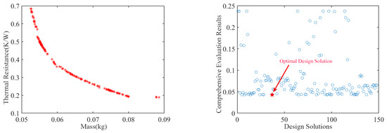 Figure 4, according to MOPSO. As shown in the figure, the range of thermal resistance is 0.2 K/W∼0.8 K/W, and the range of the mass is 0.03 kg∼0.08 kg. Overall, the changes in the values of thermal resistance and mass demonstrate an opposite relationship.