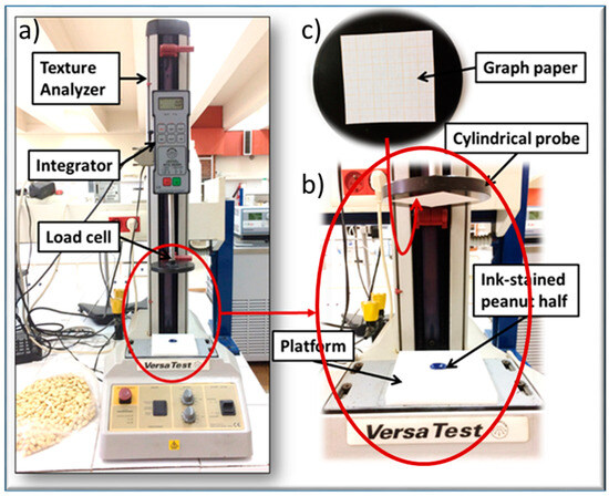 A texture analyzer (Versatest model, Mecmesin Equip X a California Corporation, San Jose, USA) equipped with a 2500 N compression load cell and an integrator was used to perform the compression tests over the peanut kernels (Figure 1). A cylindrical plate of 10 cm of diameter has been designed and fitted at the base of a mobile crosshead to simulate the pressure that could be applied during any given peanut processing stage.