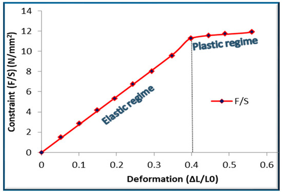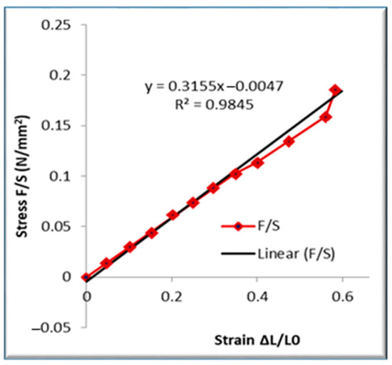 The elastic modulus is determined from the initial linear section of the stress–strain curve at relatively low deformation. For an ideal elastic material, Hooke’s law (shown in Equation (6)) states that stress (σ) is directly proportional to strain (ԑ) and to Young’s modulus of elasticity (E) [6].